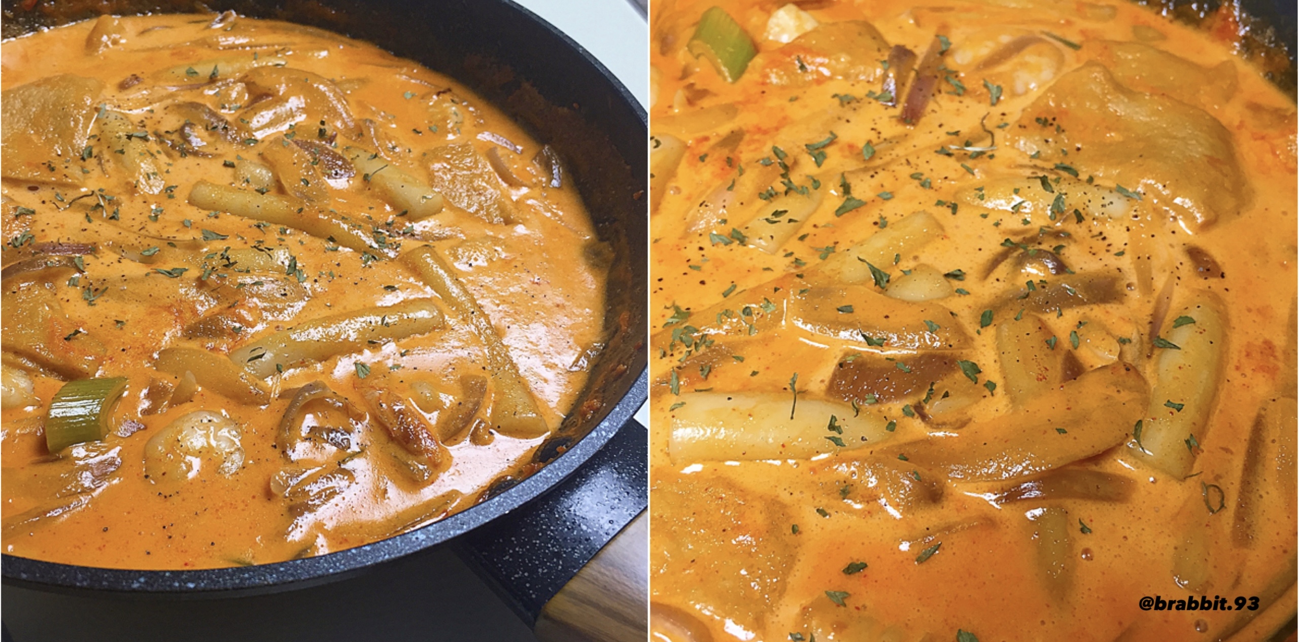 기름에 파랑 다진마늘 넣고 살짝 볶을 때 칵테일 새우랑 마늘 넣고, 물 넣을 타이밍에 물 대신 우유랑 생크림을 1:1로 넣어주면 된다.