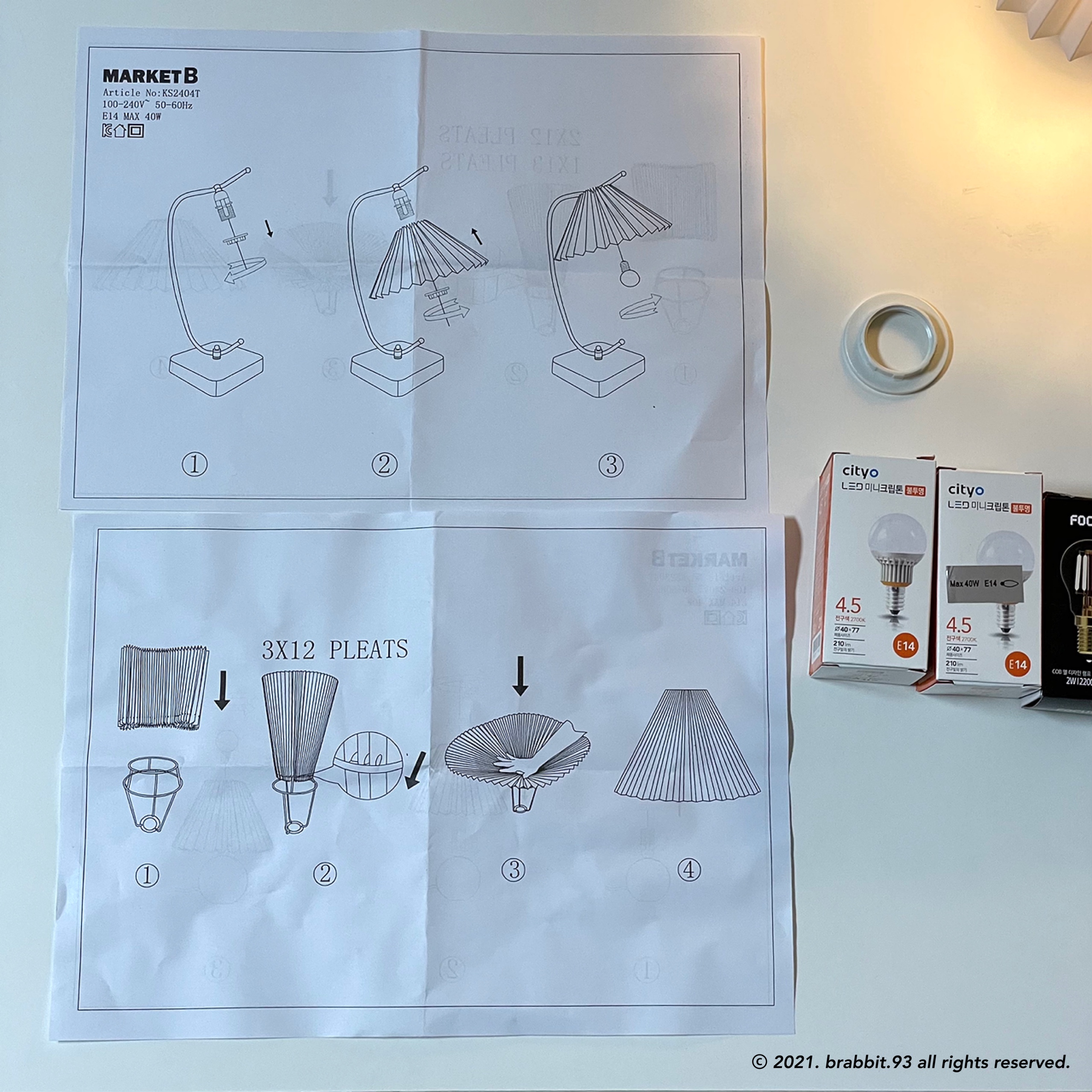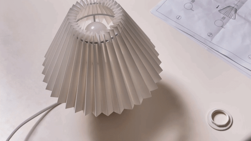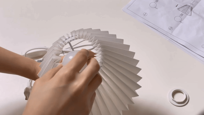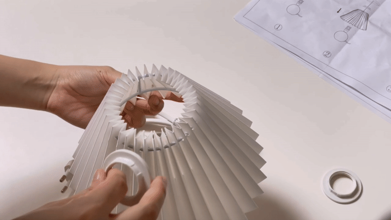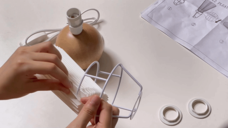 동그란 고리 빼고 - 플리츠 갓 씌우고 - 다시 동그란 고리를 넣어 고정.