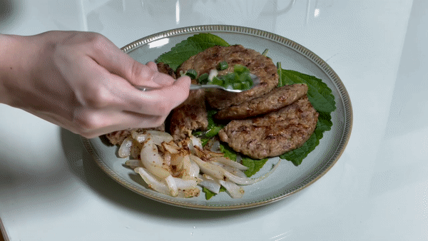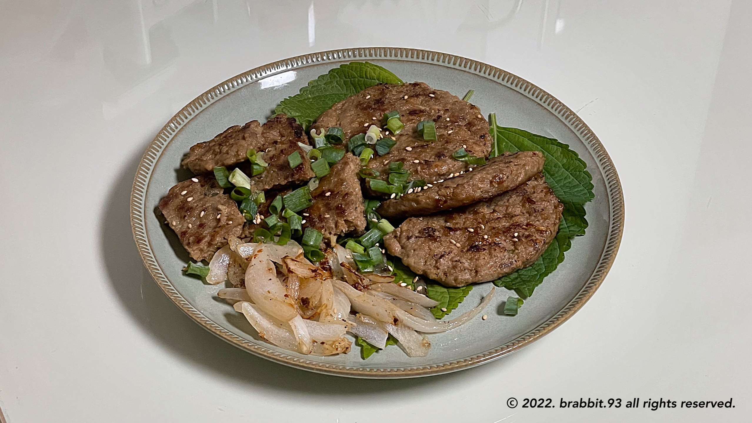 플레이팅을 위해 깻잎을 몇 장 깔아줬는데 먹을 때 떡갈비를 깻잎에 싸 먹으니 훨씬 맛있었다😋